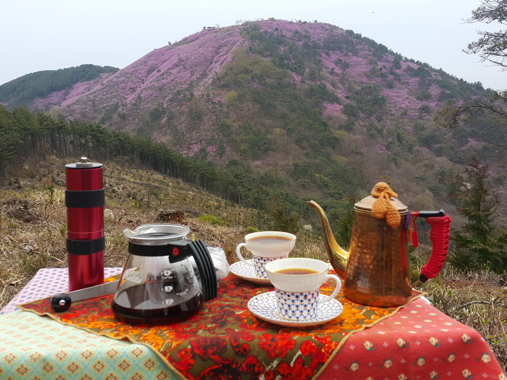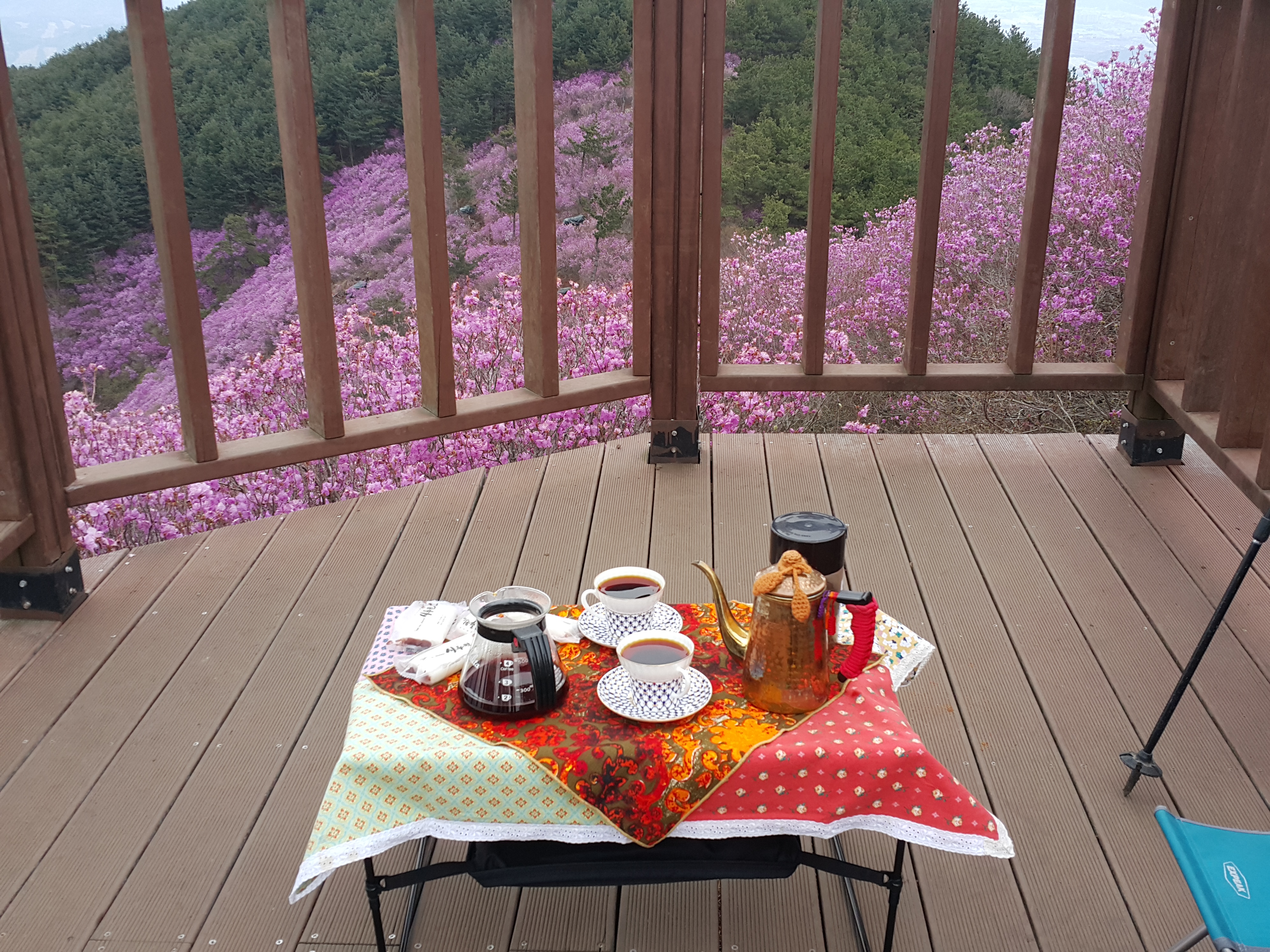 ▼ 황매평원의 철쭉화원을 바라보면서 카모님과 커피타임