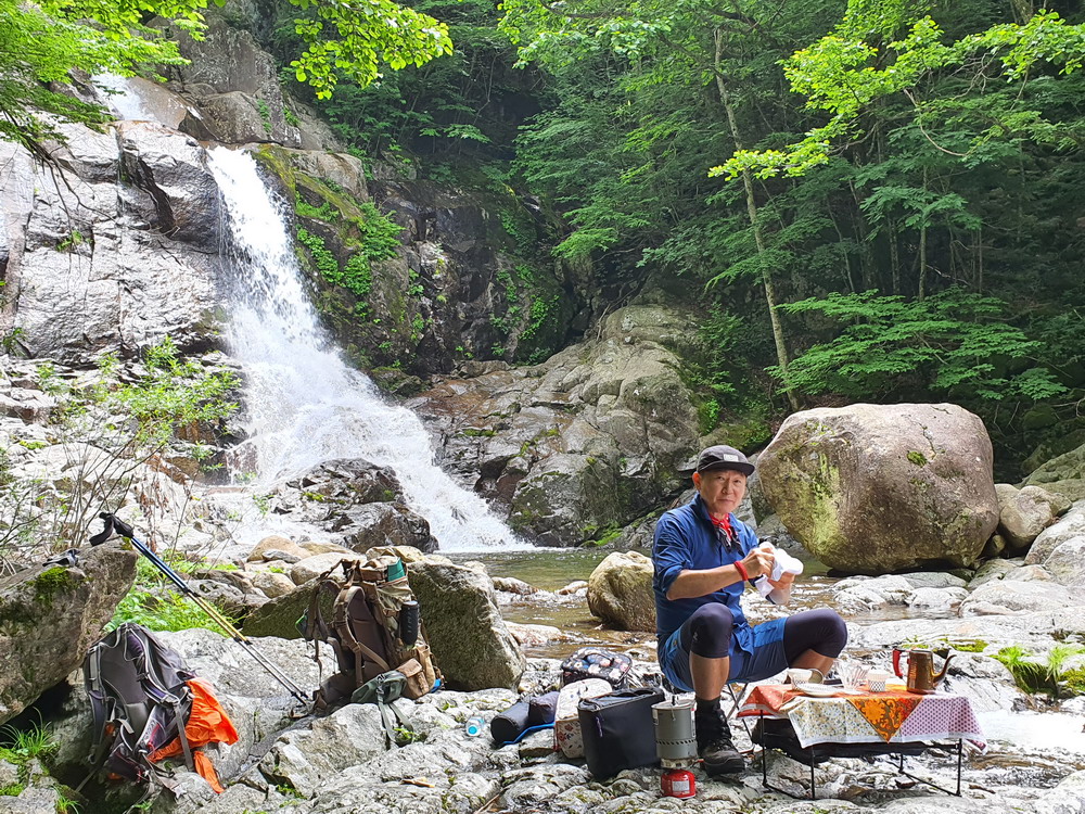 ▼ 천령폭포 아래에서 느~긋하게 점심 & 커피 시간을 갖는다