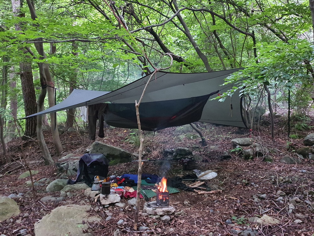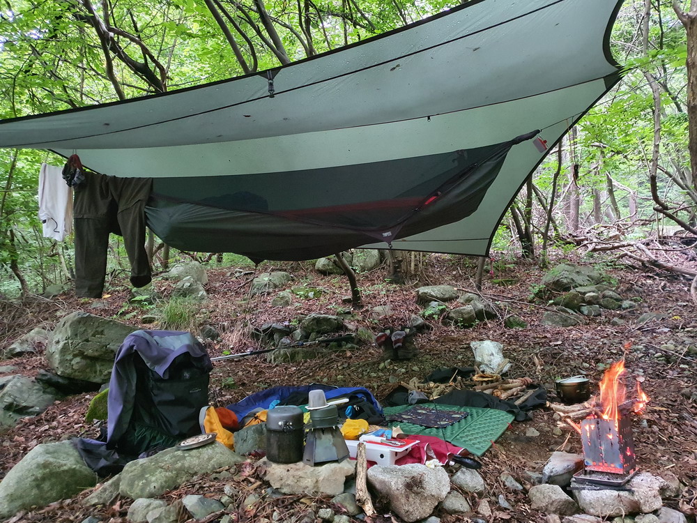 ▼ 약한 비가 내리는 와중에 서둘러 타프를 치고 그 아래에 해먹을 설치한다
