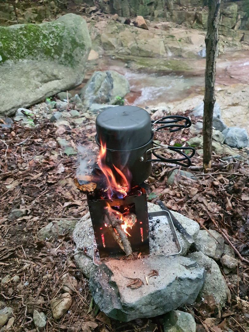 ▼ 약간 젖은 나뭇가지를 주워서 우드스토브에 불를 집힌다