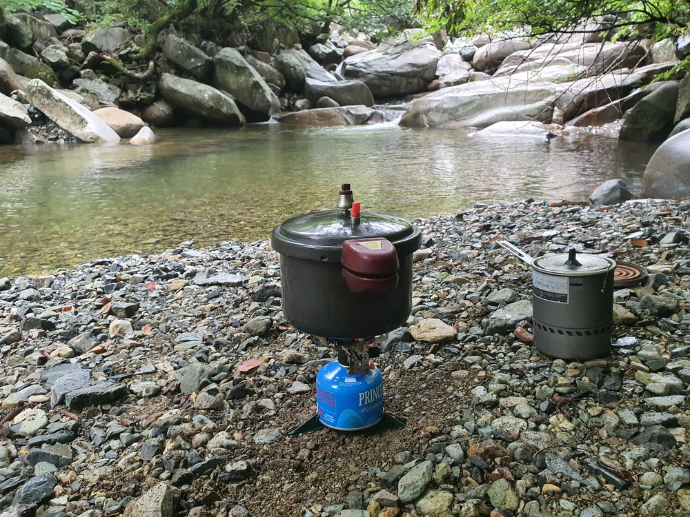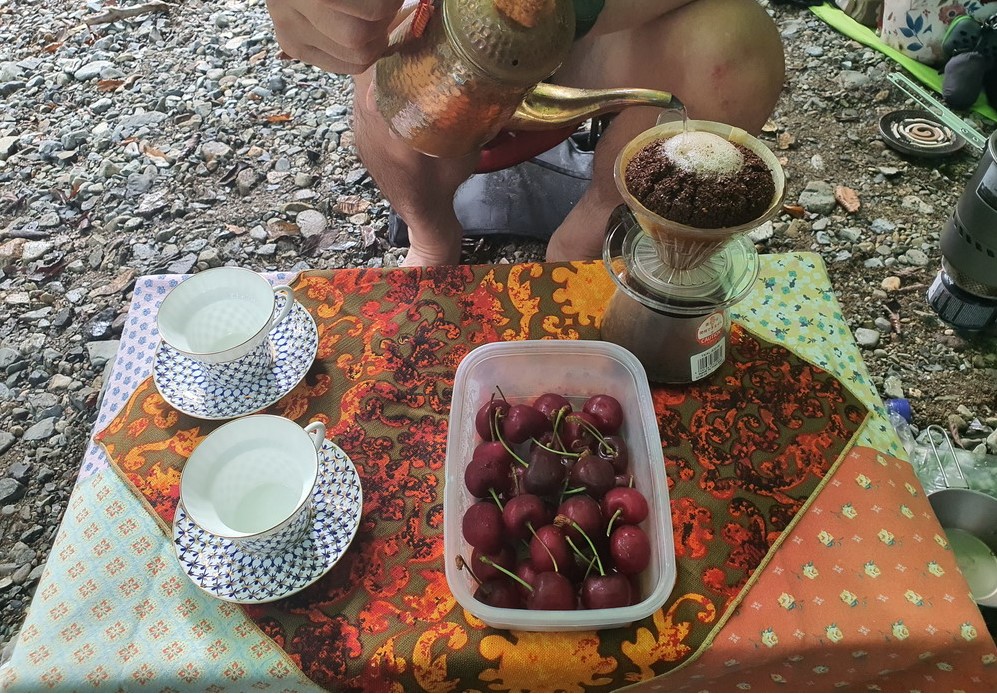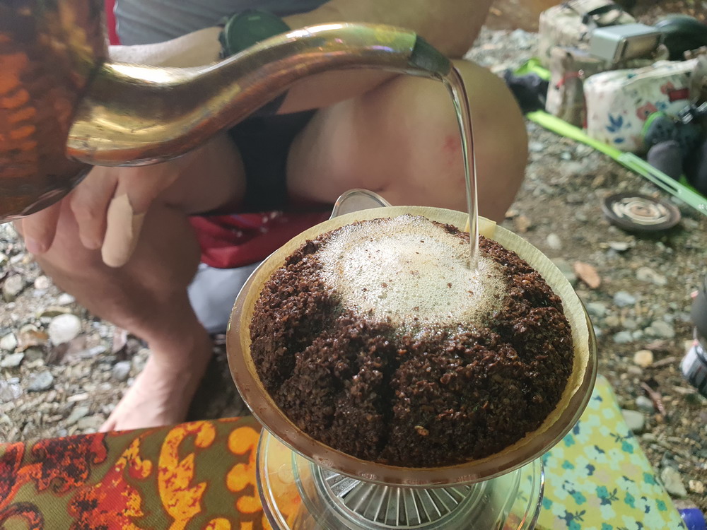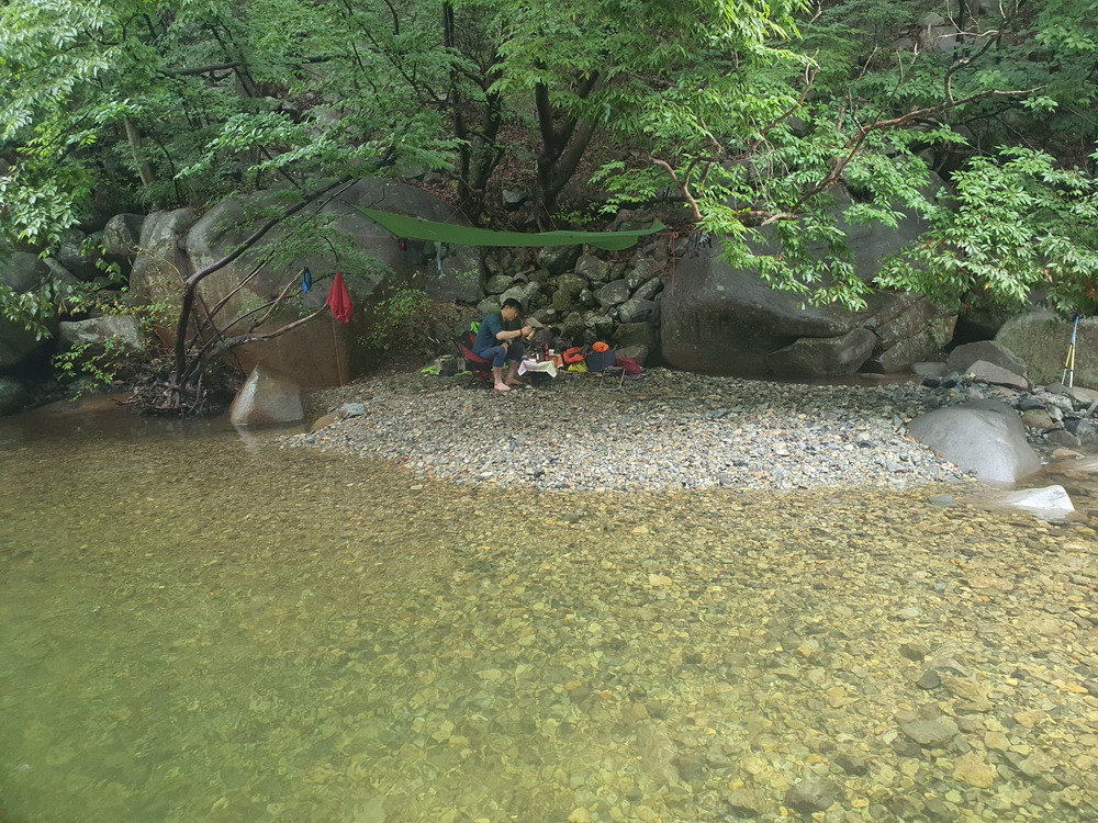 ▼ 저런 곳에 재빨리 타프를 설치하고 배낭짐을 풀고... 카모님께선 드립커피를 내리고 있다