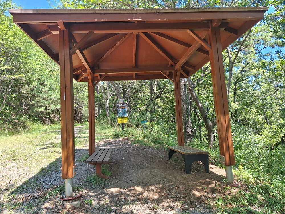 ▼백일 아침고요산길 시작지점의 사각정자 쉼터 (해발약330m)
