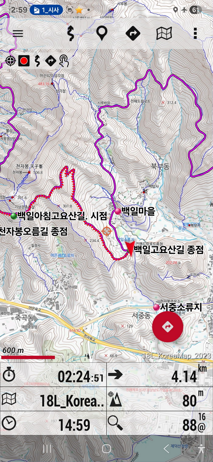 ▼백일 아침고요산길 시작점(해발 약330m) ~ 종점(해발 약80m)