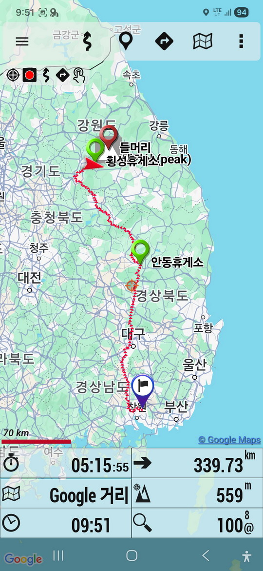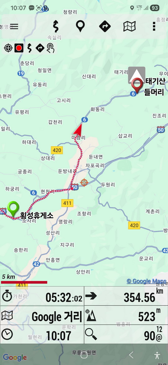 태기산터널이 뚫여있는 것을 볼 수 있다. 따라서, 현재 달리고 있는 도로는 강원도 지역