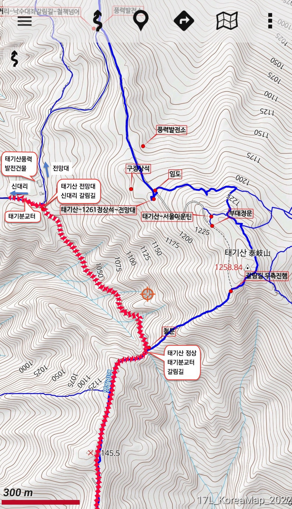 ▼바람개비 봉우리(해발약1,146m) ~ 태기분교터(해발약1,075m) 구간 상세지형도